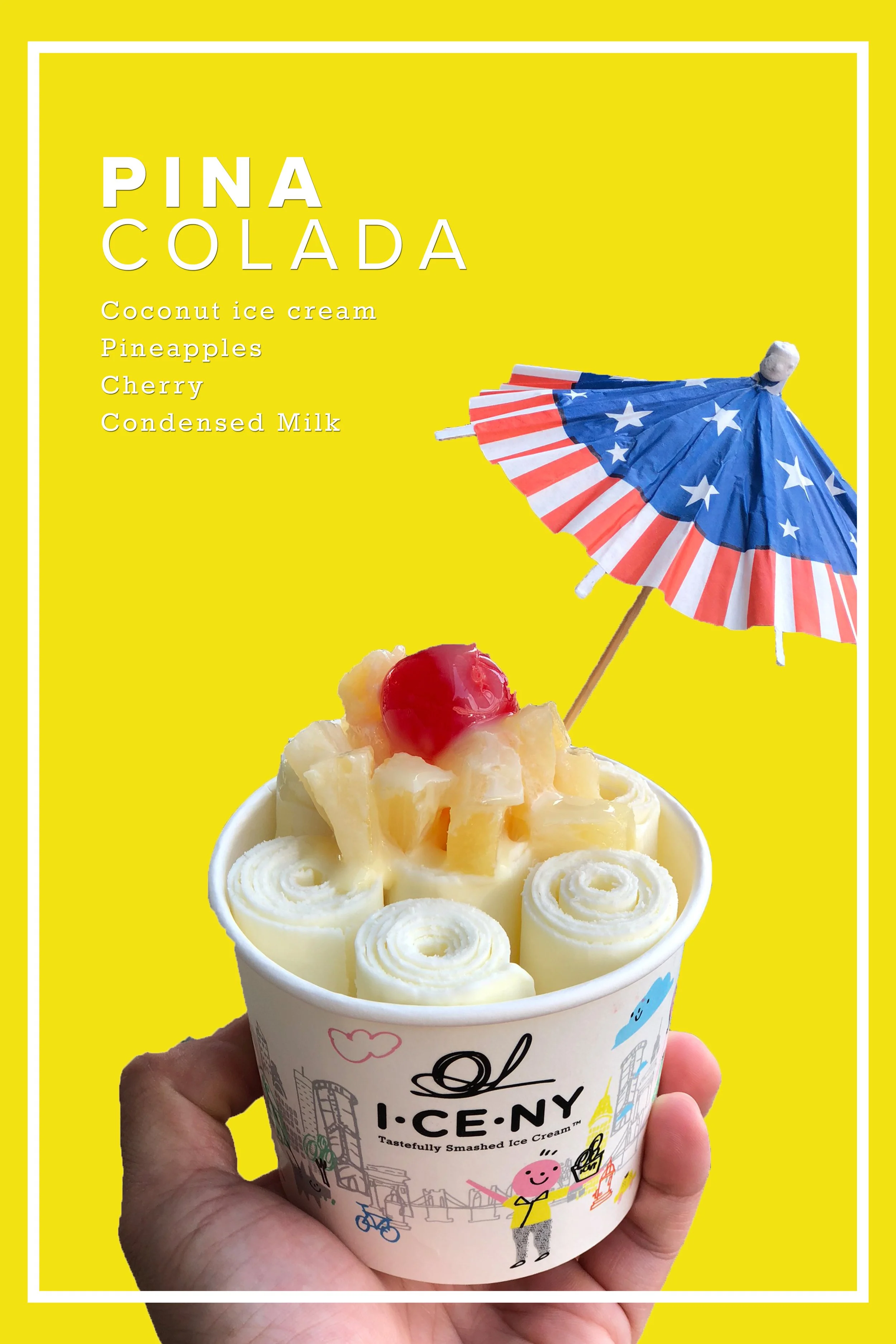 I-CE-NY is the original rolled ice cream from Thailand created by the creator of rolled ice cream machine. The ice cream is crafted fresh right in front of you. The process starts by pouring our premium ice cream base with your choice of mix-in ingredients on our custom-designed metal plate that can get as cold as -15 degrees Fahrenheit. We then use metal paddles to quickly chop and smash the ingredients together and spread it into a thin layer. In just two minutes, the ice cream firms up, and it’s scraped into chubby rolls, ready to serve.